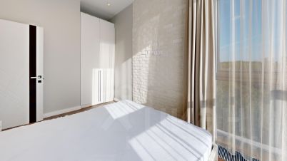 Квартира имеет продуманную планировку и панорамные окна: 2 изолированные спальные комнаты (11 + 9 кв.м.), кухня 11 кв.м., просторная гардеробная и туалетная комната с душевой.