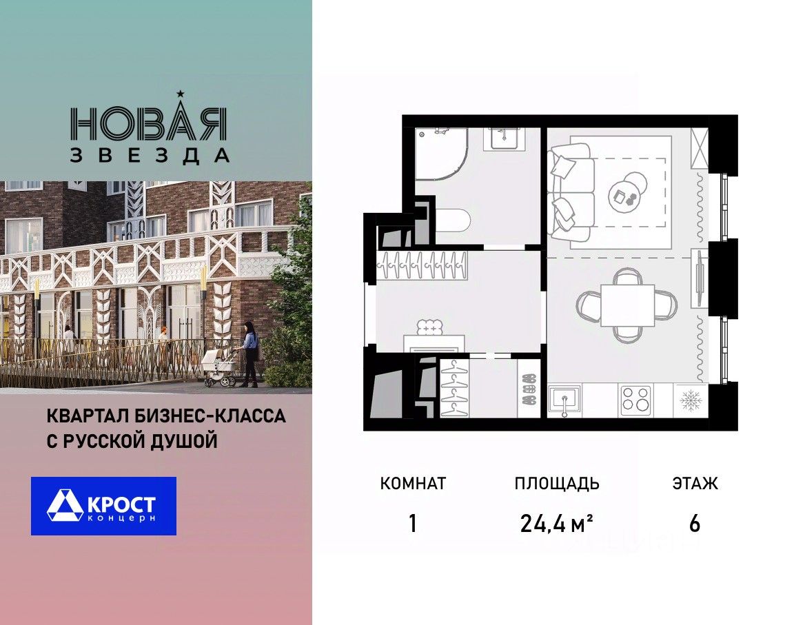 Продаётся 1-к квартира 24.4 кв.м. на 6-м этаже 22 этажного дома, корпус 6 - Резиденция "Хабаровск". Без отделки.