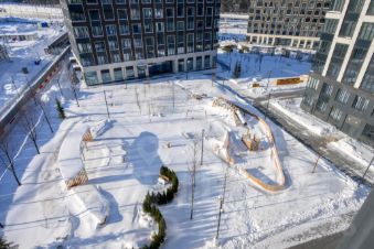-Внутренний двор для жителей - это разноцветный сад с нейродинамическими детскими площадками и приватными зонами для взрослых