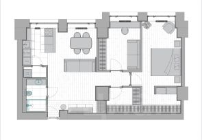 Функциональная планировка: ПРОСТОРНАЯ зона гостиной и кухни с островом отделена от жилого блока из 2 комнат.
