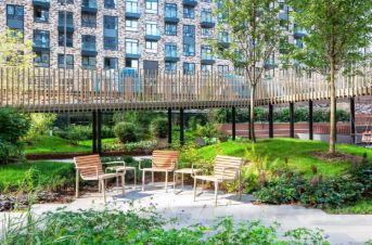 Пешеходный мост делит территорию на автономные зоны: амфитеатр, лаундж-зоны, игровые локации и места для работы на свежем воздухе.