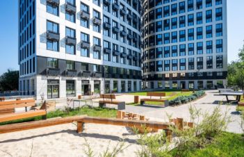 Благоустройство: современный двухуровневый двор с детскими площадками, зоной для воркаута, полем для игры в волейбол, а также с тихой и приватной зоной на крыше стилобата, откуда открываются панорамные виды на Москву-реку.