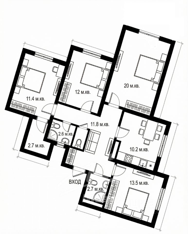 Квартира требует ремонта. Окна выходят на две стороны: юго-запад и северо-восток. В квартире 2 санузла, кладовая, кухня 10,2 кв.м, все комнаты (13.5 кв.м. +20 кв.м. +12 кв.м.+11,4 кв.м.) изолированные. Квартира продается без мебели.