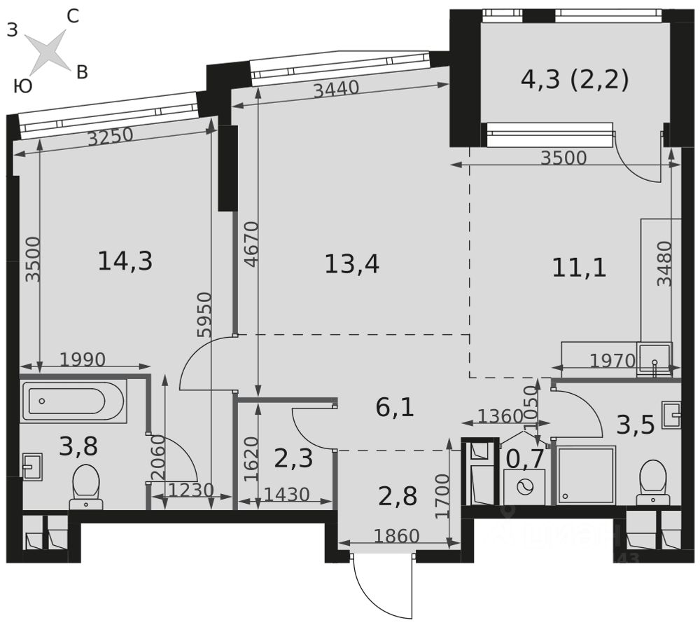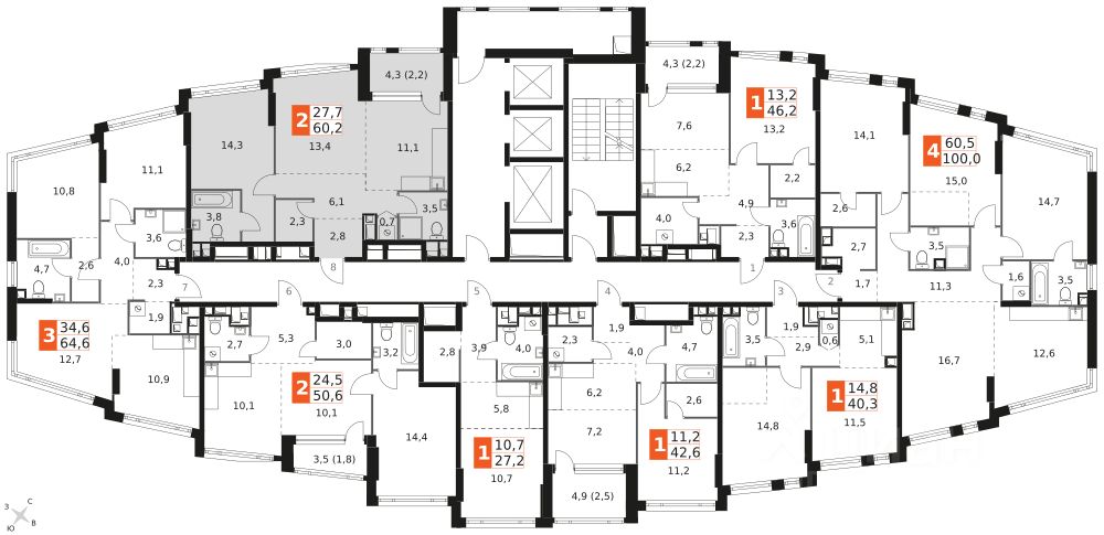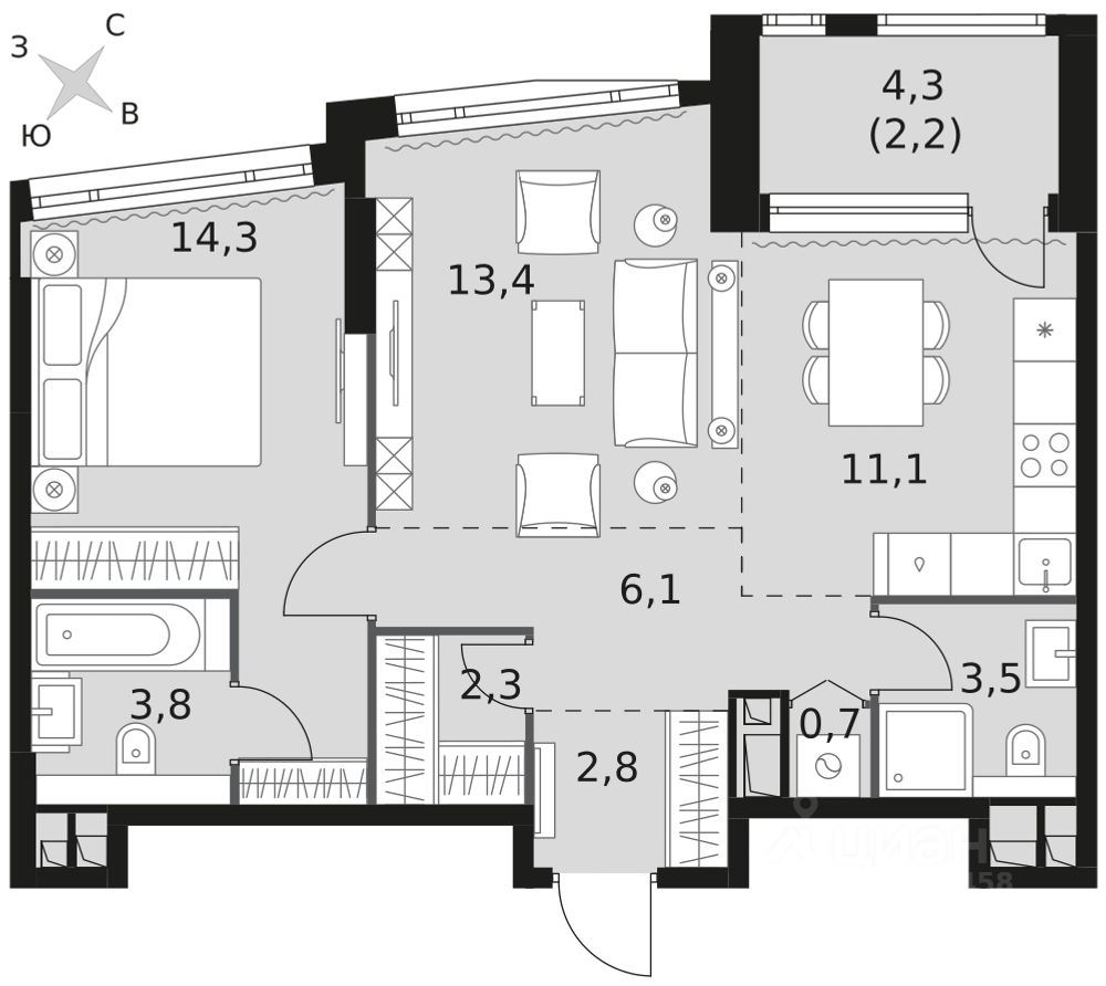 Продаётся 2-к квартира номер 94 общей площадью 60.2 кв.м. на 13-м этаже 29 этажного здания. Отделка Whitebox. Цена с учётом скидки.