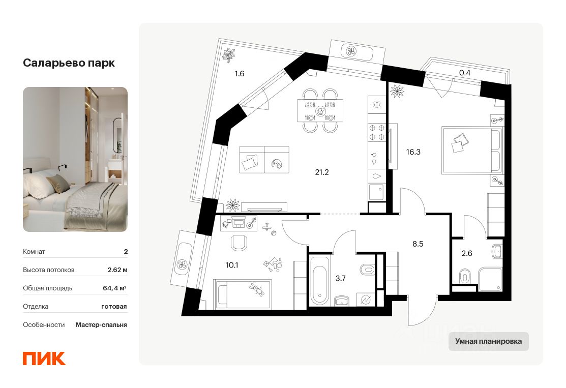 Продаётся 2-комн. квартира площадью 64,4 кв.м на 16 этаже 22 этажного дома (Корпус 73, Секция 1) проекта ПИК Саларьево парк. Светлый просторный подъезд на уровне земли, функциональная планировка, большие окна, c отделкой.