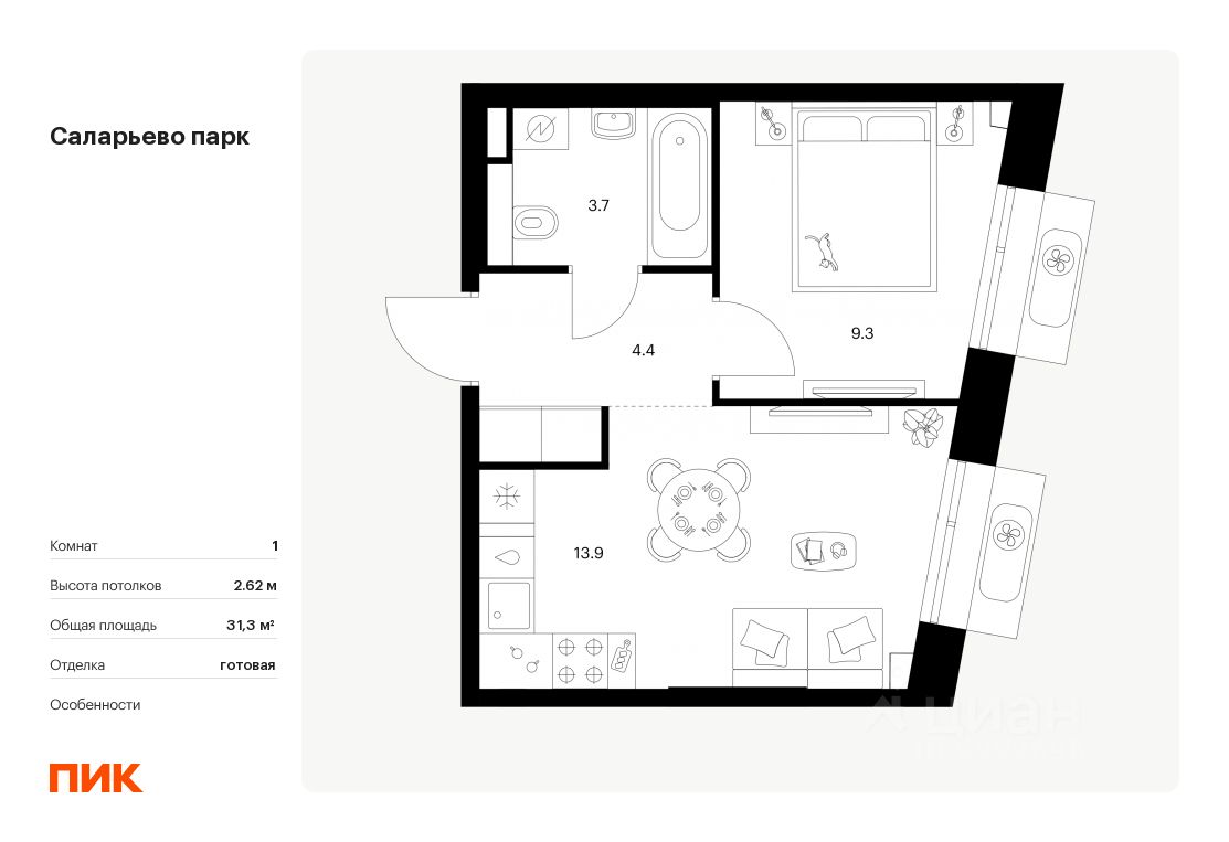 Продаётся 1-комн. квартира площадью 31,3 кв.м на 13 этаже 22 этажного дома (Корпус 73, Секция 1) проекта ПИК Саларьево парк. Светлый просторный подъезд на уровне земли, функциональная планировка, большие окна, c отделкой.