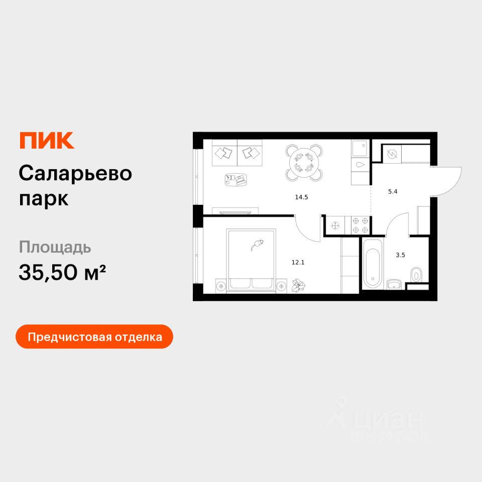 Продаётся 1-комн. квартира площадью 35,5 кв.м на 2 этаже 16 этажного дома (Корпус 57.1, Секция 1) проекта ПИК Саларьево парк. Светлый просторный подъезд на уровне земли, функциональная планировка, большие окна, предчистовая отделка.