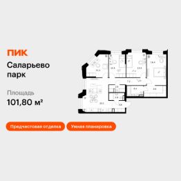 Продаётся 4-комн. квартира площадью 101,8 кв.м на 6 этаже 23 этажного дома (Корпус 69.1, Секция 1) проекта ПИК Саларьево парк. Светлый просторный подъезд на уровне земли, функциональная планировка, большие окна, предчистовая отделка.