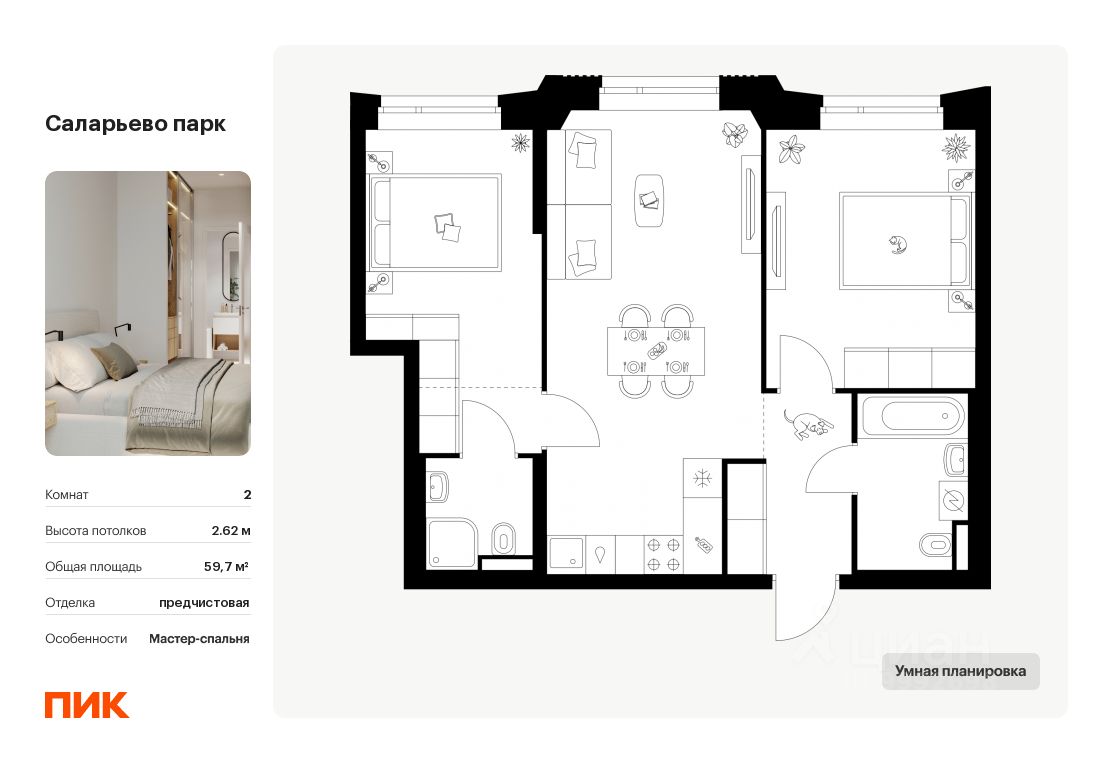 Продаётся 2-комн. квартира площадью 59,7 кв.м на 18 этаже 23 этажного дома (Корпус 69.1, Секция 1) проекта ПИК Саларьево парк. Светлый просторный подъезд на уровне земли, функциональная планировка, большие окна, предчистовая отделка.