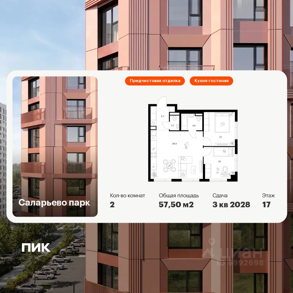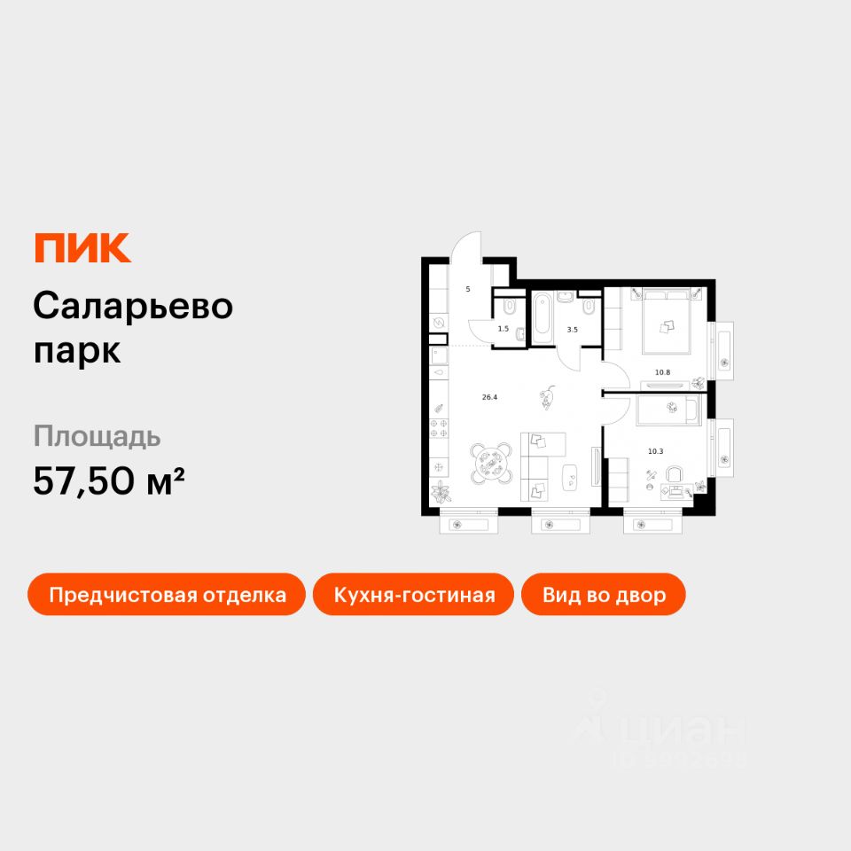 Продаётся 2-комн. квартира площадью 57,5 кв.м на 15 этаже 23 этажного дома (Корпус 69.1, Секция 1) проекта ПИК Саларьево парк. Светлый просторный подъезд на уровне земли, функциональная планировка, большие окна, предчистовая отделка.