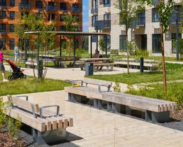 Все корпуса в квартале гармонично сочетаются, образуя единую городскую среду. Между собой их объединяет невысокая этажность и натуральная цветовая гамма. Здесь приятно гулять и проводить время на улице всей семьёй.
