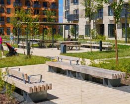 Все корпуса в квартале гармонично сочетаются, образуя единую городскую среду. Между собой их объединяет невысокая этажность и натуральная цветовая гамма. Здесь приятно гулять и проводить время на улице всей семьёй.