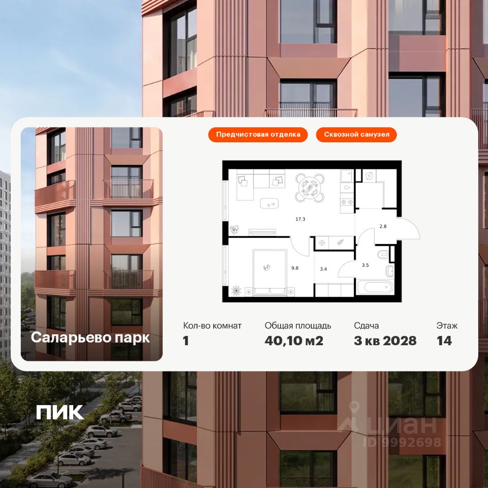 Продаётся 1-комн. квартира площадью 40,1 кв.м на 9 этаже 23 этажного дома (Корпус 69.1, Секция 1) проекта ПИК Саларьево парк. Светлый просторный подъезд на уровне земли, функциональная планировка, большие окна, предчистовая отделка.