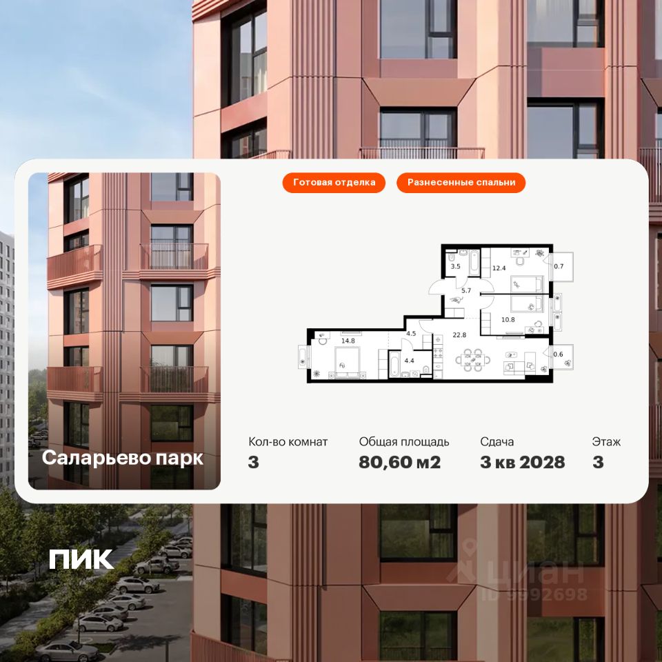 Продаётся 3-комн. квартира площадью 80,6 кв.м на 5 этаже 14 этажного дома (Корпус 69.2, Секция 2) проекта ПИК Саларьево парк. Светлый просторный подъезд на уровне земли, функциональная планировка, большие окна, c отделкой.