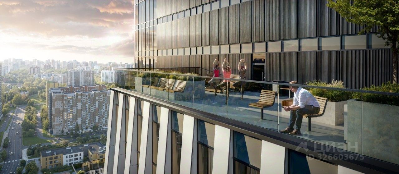 В корпусе 1.4 появится общественная терраса на 30-м этаже. Доступ сюда есть только у жителей, поэтому вы не встретите в этом пространстве посторонних людей. Здесь можно заниматься спортом, отдохнуть за чтением книги или создать собственный сад. А ещё отсюда открываются красивые виды на город.