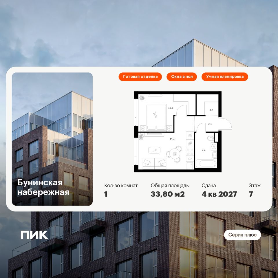 Продаётся 1-комн. квартира площадью 33,8 кв.м на 9 этаже 16 этажного дома (Корпус 2.6/1.1, Секция 1) проекта ПИК Бунинская набережная. Светлый просторный подъезд на уровне земли, функциональная планировка, большие окна, c отделкой.