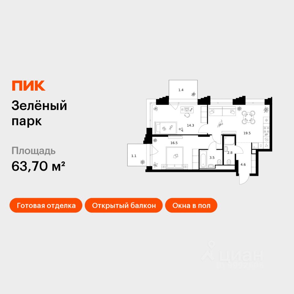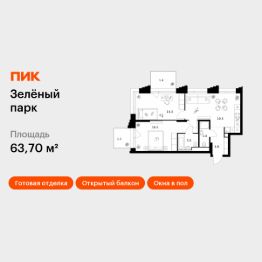 Продаётся 2-комн. квартира площадью 63,7 кв.м на 6 этаже 28 этажного дома (Корпус 5.4, Секция 5) проекта ПИК Зелёный парк. Светлый просторный подъезд на уровне земли, функциональная планировка, большие окна, c отделкой.