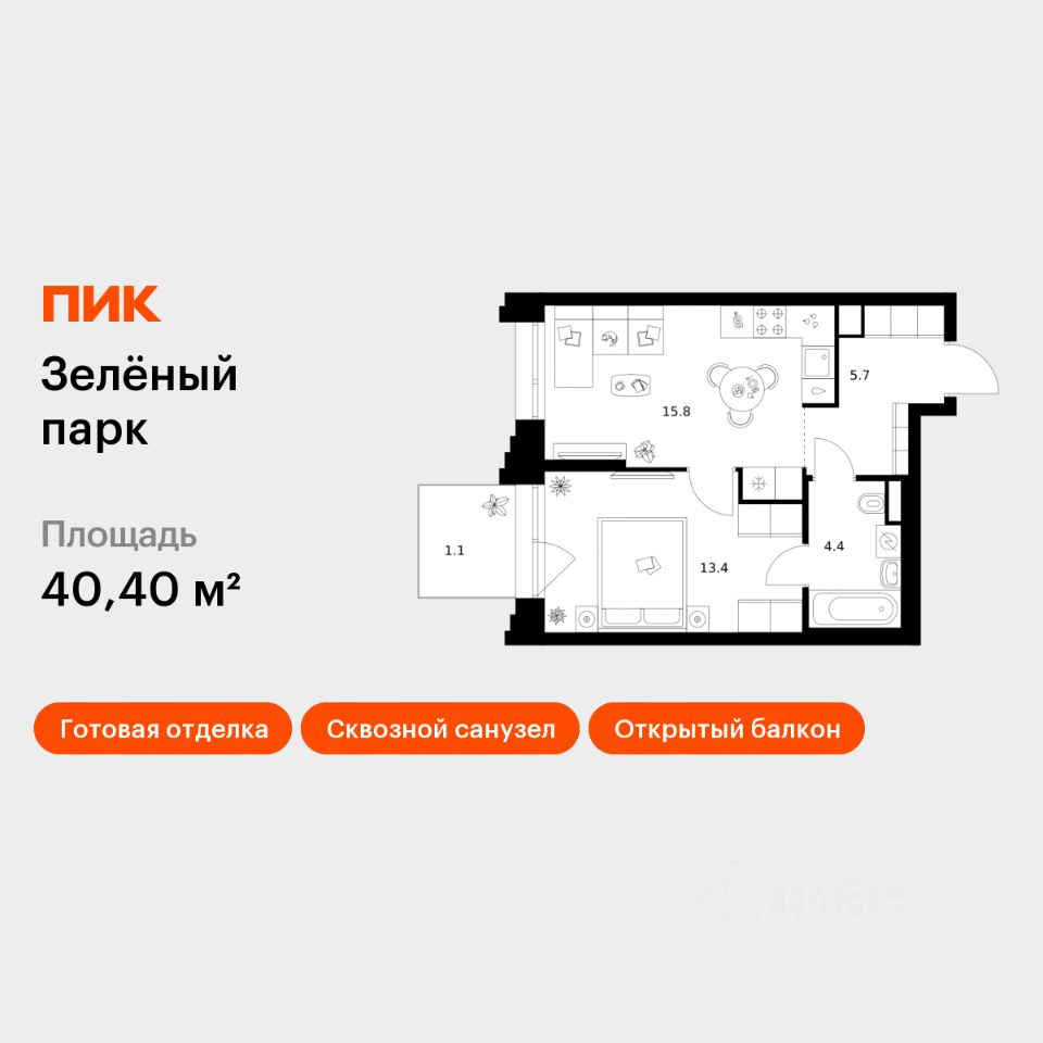 Продаётся 1-комн. квартира площадью 40,4 кв.м на 13 этаже 28 этажного дома (Корпус 5.4, Секция 5) проекта ПИК Зелёный парк. Светлый просторный подъезд на уровне земли, функциональная планировка, большие окна, c отделкой.