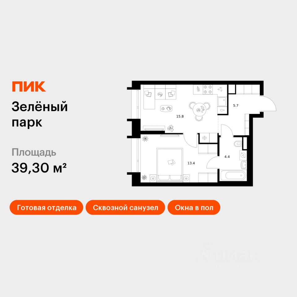 Продаётся 1-комн. квартира площадью 39,3 кв.м на 12 этаже 28 этажного дома (Корпус 5.4, Секция 5) проекта ПИК Зелёный парк. Светлый просторный подъезд на уровне земли, функциональная планировка, большие окна, c отделкой.