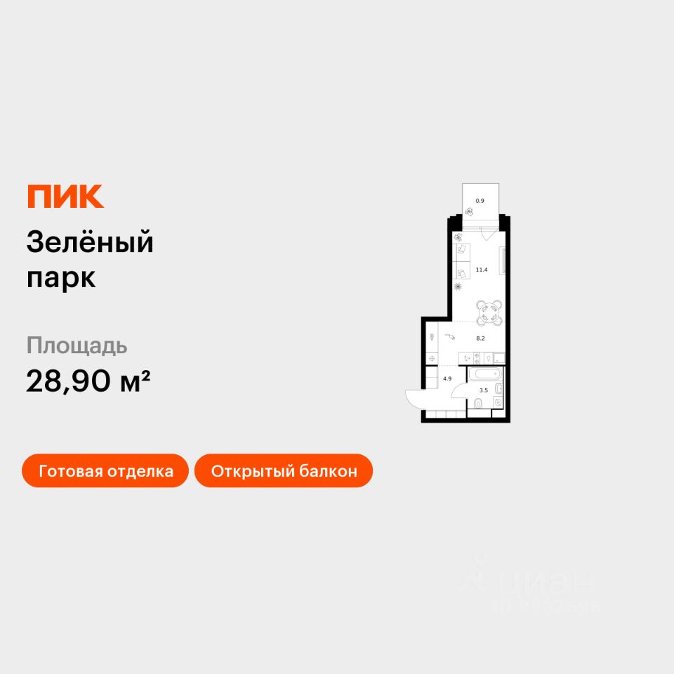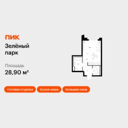 Продаётся квартира-студия площадью 28,9 кв.м на 2 этаже 28 этажного дома (Корпус 5.4, Секция 5) проекта ПИК Зелёный парк. Светлый просторный подъезд на уровне земли, функциональная планировка, большие окна, c отделкой.