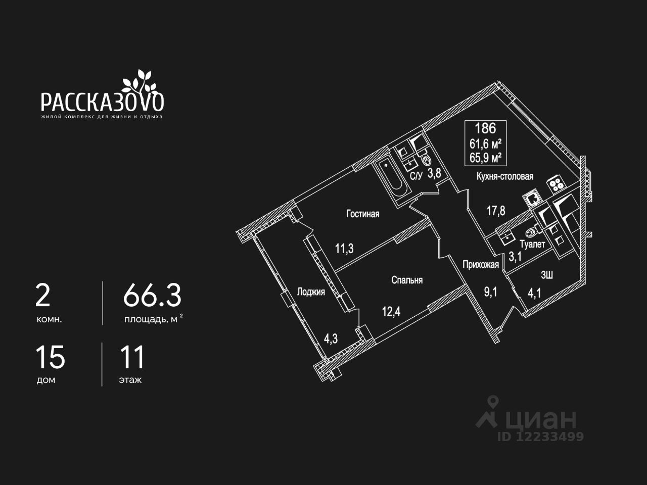 Продается 2-комнатная квартира в ЖК Рассказово на 11 этаже. Общая площадь квартиры составляет 66,3 кв.м. Квартира без отделки.