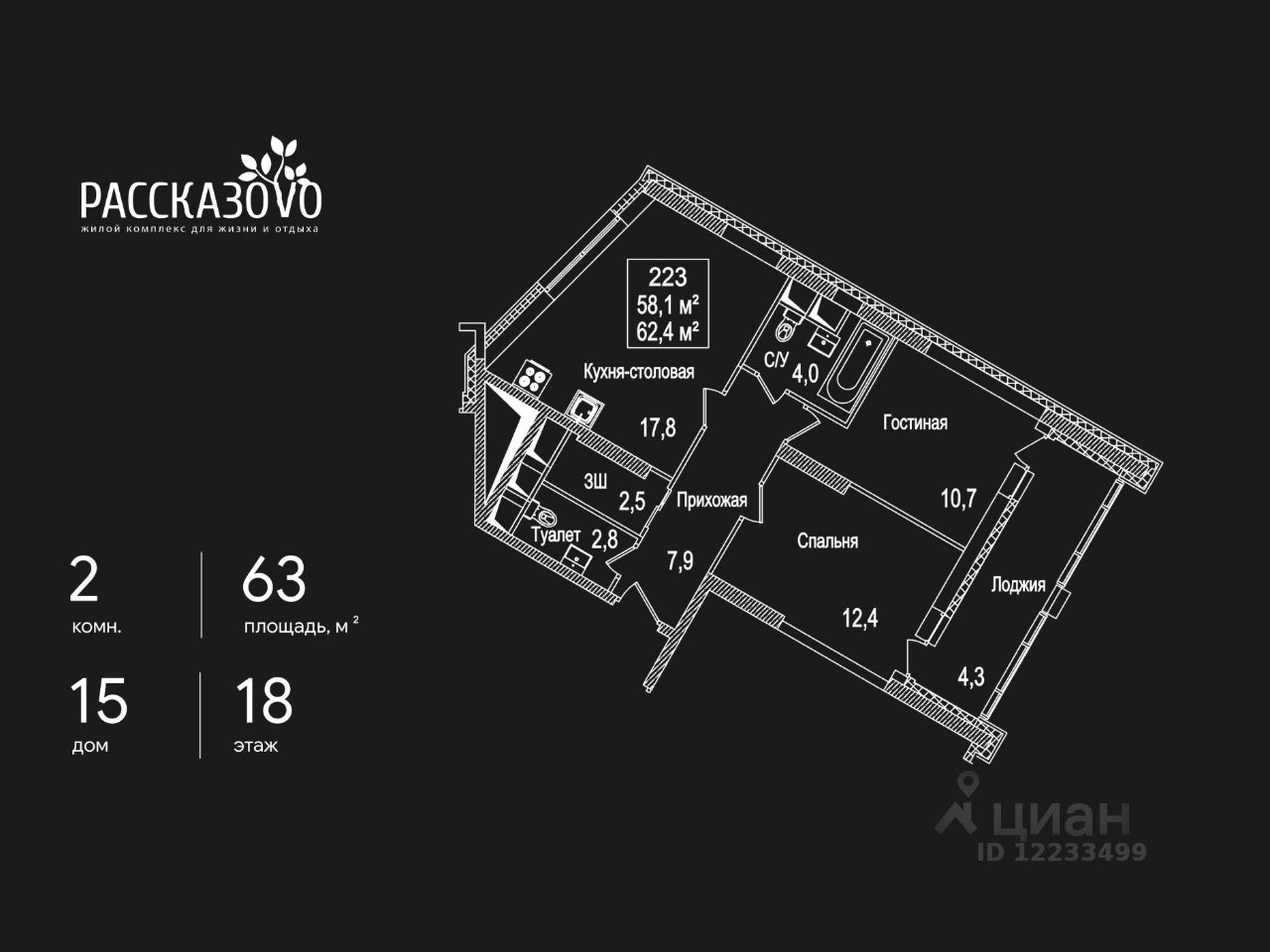 Продается 2-комнатная квартира в ЖК Рассказово на 18 этаже. Общая площадь квартиры составляет 63 кв.м. Квартира без отделки.
