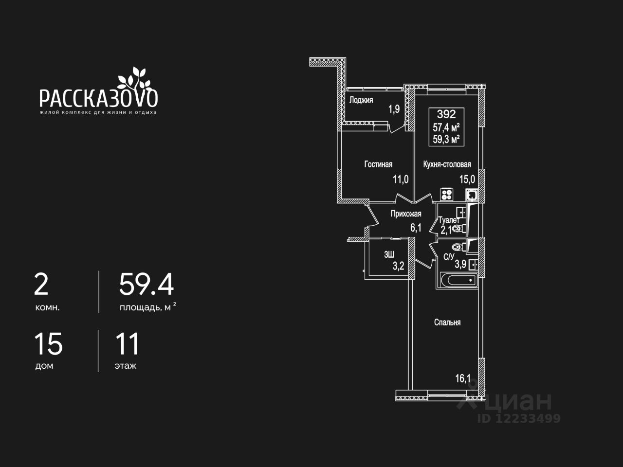 Продается 2-комнатная квартира в ЖК Рассказово на 11 этаже. Общая площадь квартиры составляет 59,4 кв.м. Квартира без отделки.