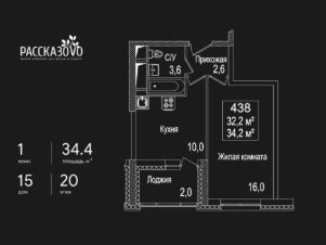 Продается 1-комнатная квартира в ЖК Рассказово на 20 этаже. Общая площадь квартиры составляет 34,4 кв.м. Квартира без отделки.