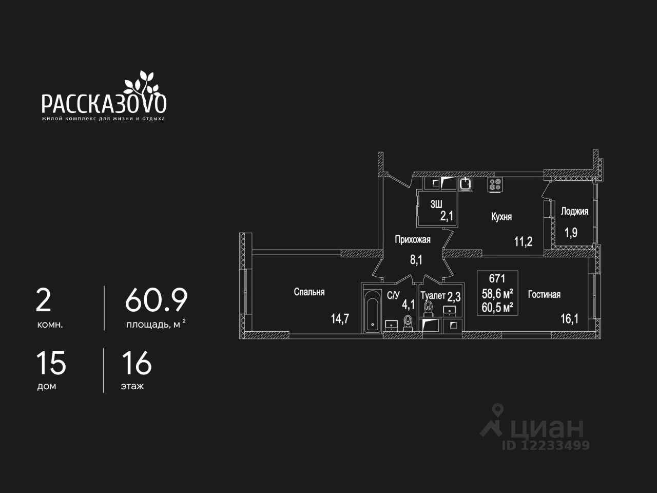 Продается 2-комнатная квартира в ЖК Рассказово на 16 этаже. Общая площадь квартиры составляет 60,9 кв.м. Квартира без отделки.