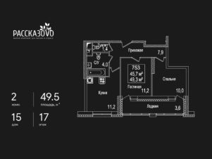 Продается 2-комнатная квартира в ЖК Рассказово на 17 этаже. Общая площадь квартиры составляет 49,5 кв.м. Квартира без отделки.