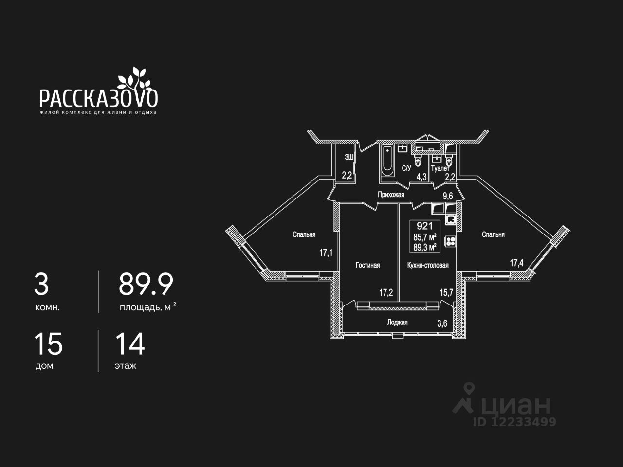 Продается 3-комнатная квартира в ЖК Рассказово на 14 этаже. Общая площадь квартиры составляет 89,9 кв.м. Квартира без отделки.