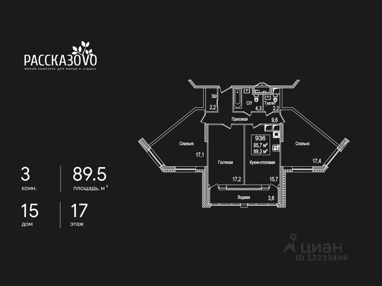 Продается 3-комнатная квартира в ЖК Рассказово на 17 этаже. Общая площадь квартиры составляет 89,5 кв.м. Квартира без отделки.