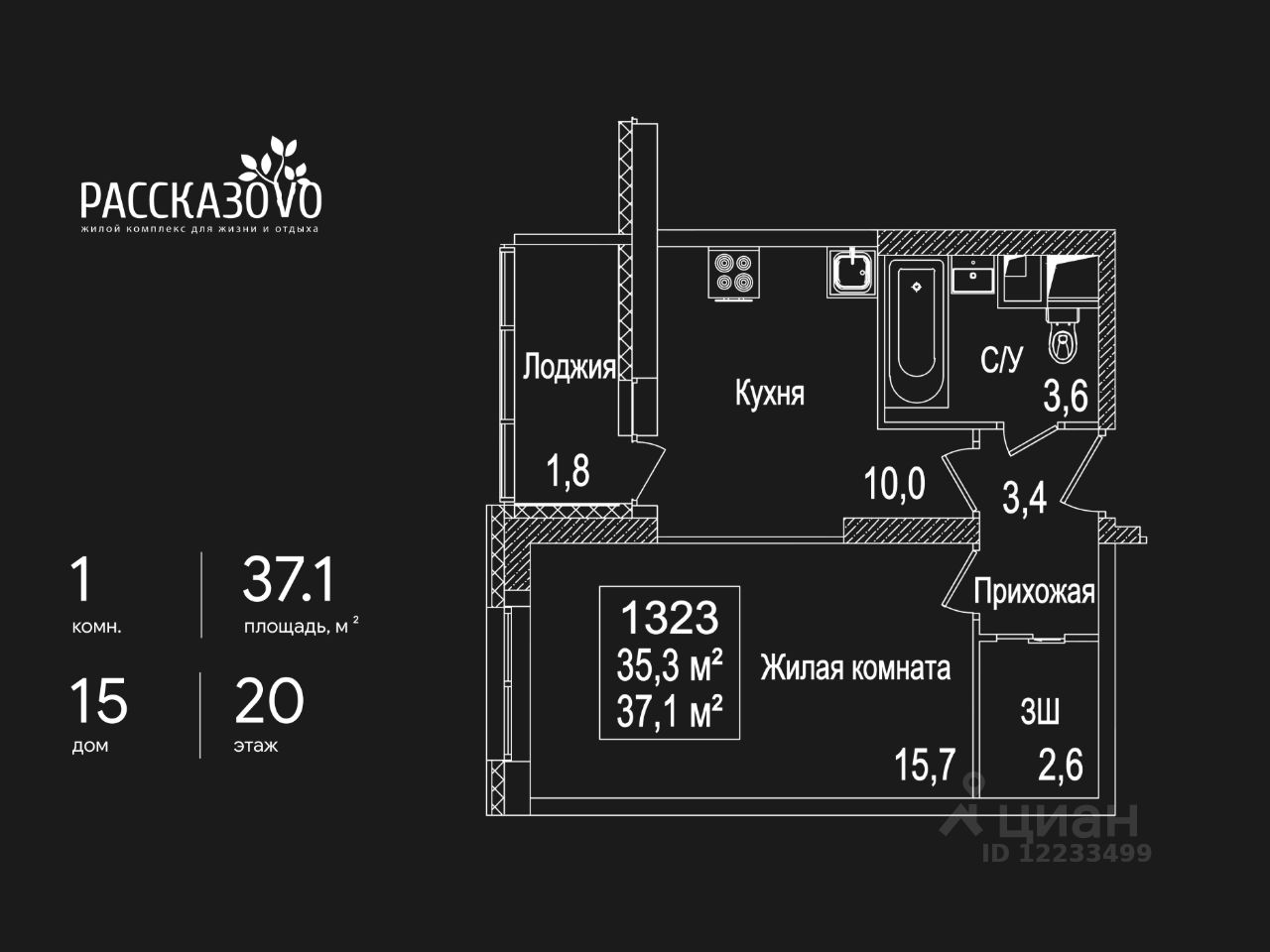Продается 1-комнатная квартира в ЖК Рассказово на 20 этаже. Общая площадь квартиры составляет 37,1 кв.м. Квартира без отделки.