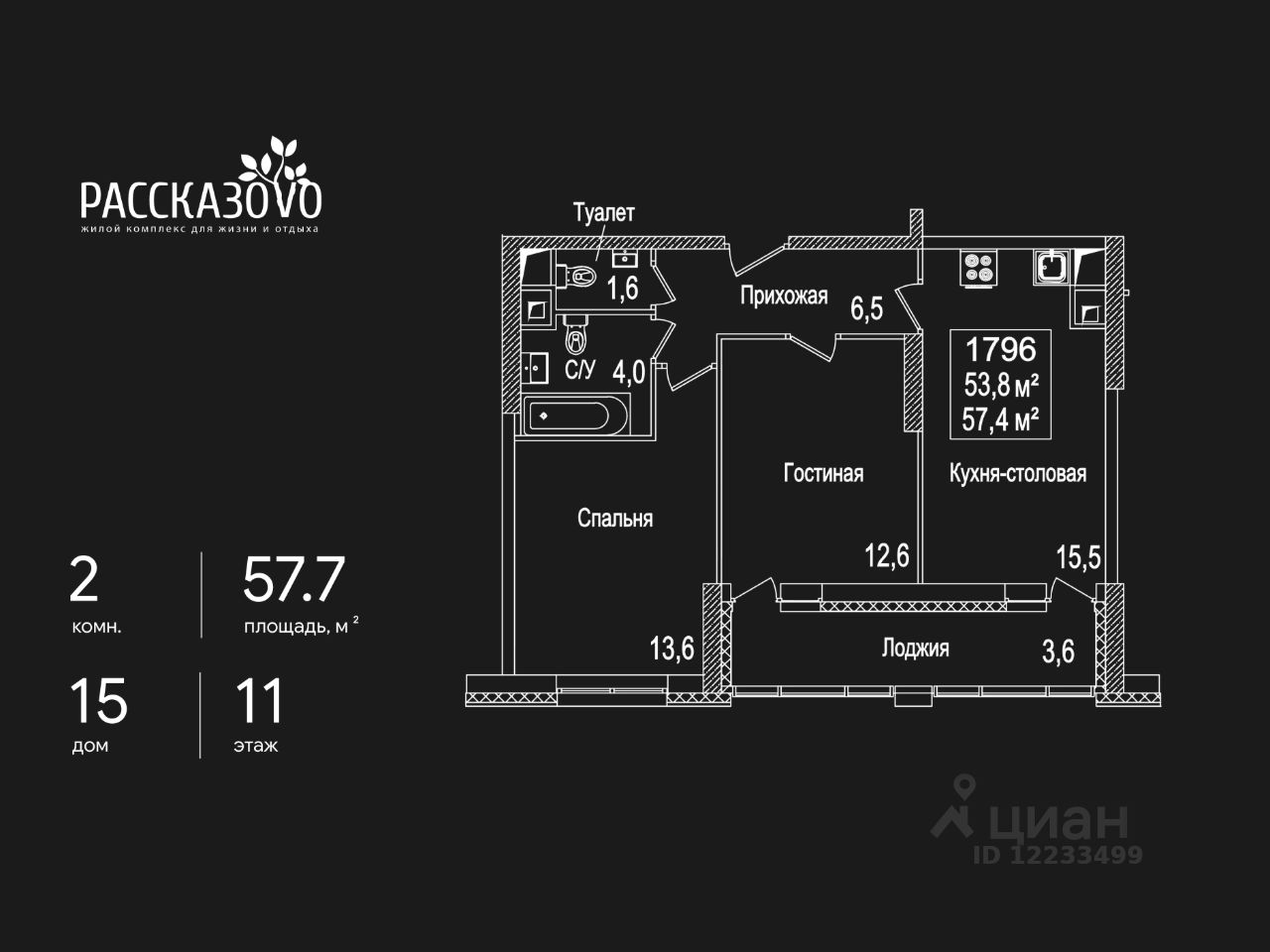 Продается 2-комнатная квартира в ЖК Рассказово на 11 этаже. Общая площадь квартиры составляет 57,7 кв.м. Квартира без отделки.