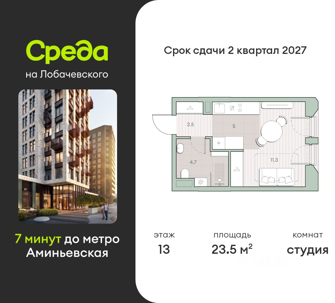 Продаётся студия общей площадью 23.5 кв.м. без отделки. Квартира расположена на 13 этаже корпуса 5.1 в жилом комплексе бизнес-класса "Среда на Лобачевского" в пешей доступности от метро "Аминьевская".