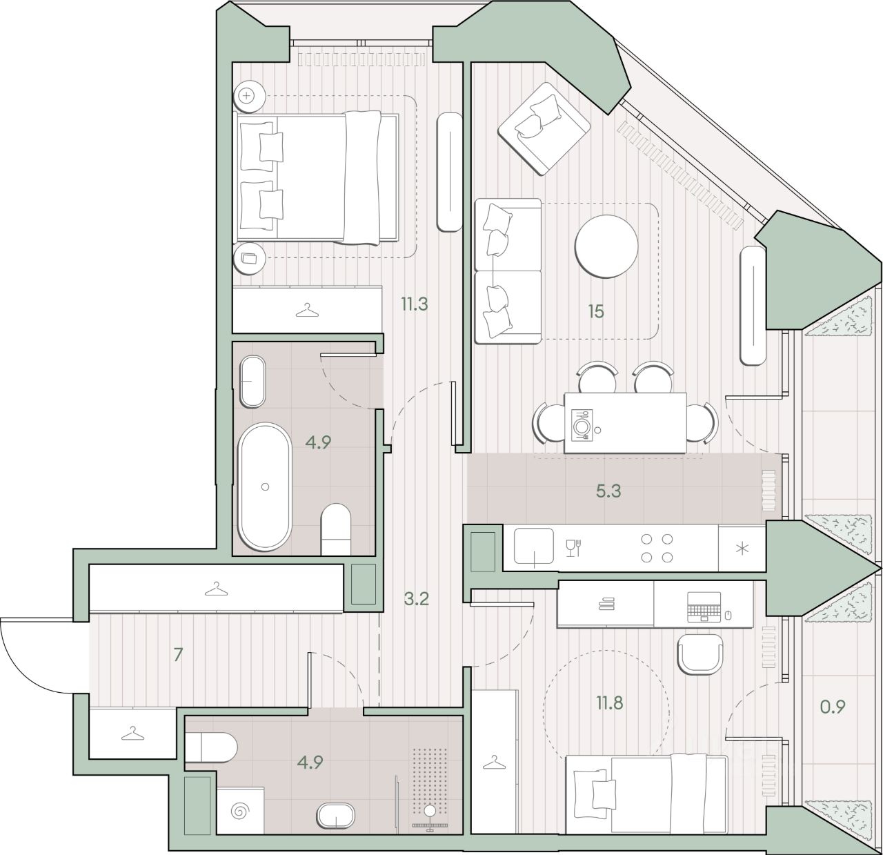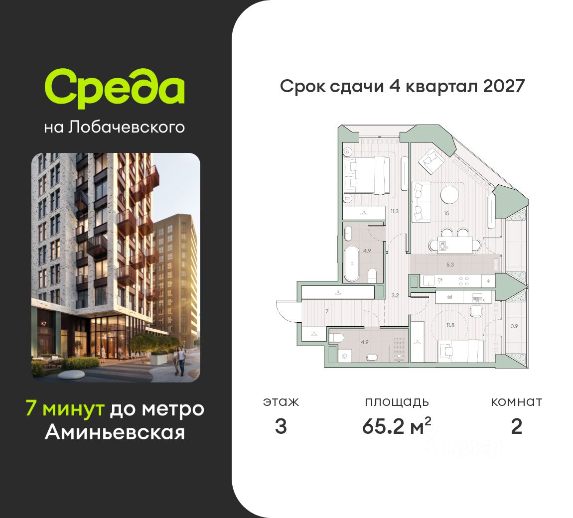 Продаётся 2-комнатная квартира общей площадью 65.2 кв.м. без отделки. Квартира расположена на 3 этаже корпуса 5.7 в жилом комплексе бизнес-класса "Среда на Лобачевского" в пешей доступности от метро "Аминьевская".