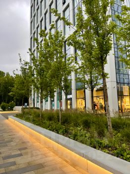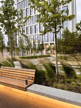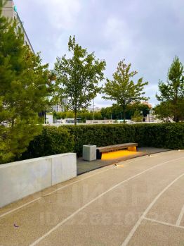 - Терраса на свежем воздухе в окружении парка, с зонами отдыха, рядом шезлонгов, прорезиненной беговой дорожкой, фитнес островками и тд.