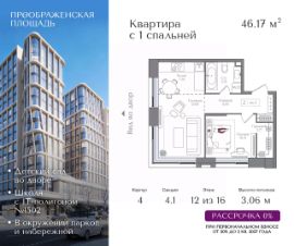Квартира на 12 этаже в жилом комплексе премиум-класса "Преображенская площадь". Общая площадь: 46.17 кв.м.