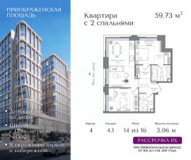 Квартира на 14 этаже в жилом комплексе премиум-класса "Преображенская площадь". Общая площадь: 59.73 кв.м.