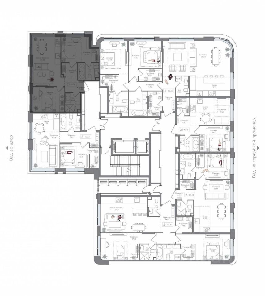 Внутренний двор 1,5 га функциональное и безопасное пространство для игр, работы и занятий спортом. Пешеходный променад для прогулок. Дома переменной этажности. Есть подземный паркинг.