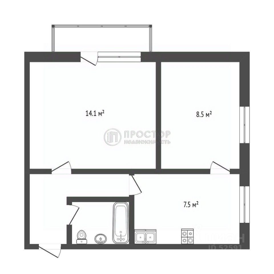 Удобная планировка: квартира имеет большую комнату с выходом на балкон - 14,1 м², вторая - 8,5 м². Достаточно просторная кухня - 7,5 м².