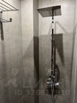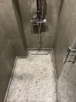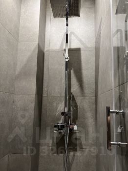 Душевая: на полу цельная гранитная плита с трапом (индивидуальный заказ), душевая система(тропический душ, ручной душ, смеситель) с термостатом.