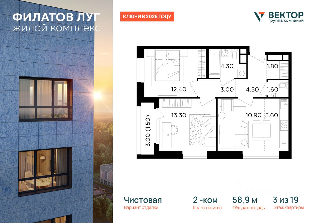 Продается 2-комн. кв-ра площадью 58,9 кв.м на 3 этаже 19 этажного дома в ЖК "Филатов Луг" от Группа компаний Вектор. Расположение