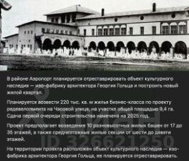 • Планируется восстановление изофабрики Георгия Гольца. После реставрации пространство станет культурной и творческой точкой притяжения для района и Москвы.