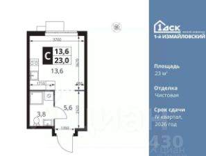 Продается квартира-студия общей площадью 23 кв.м., в ЖК "1-ый Измайловский". Квартира с чистовой отделкой и санузлом. Переуступка прав требования.