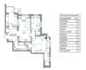 Общая площадь квартиры 104,2 кв. м, плюс к этой площади идет большая летняя терраса площадью 80 кв. м. Высокие потолки в 3 метра создают ощущение простора и света.