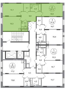 Общая площадь квартиры - 67,4 кв. м, этаж 11 из 17.