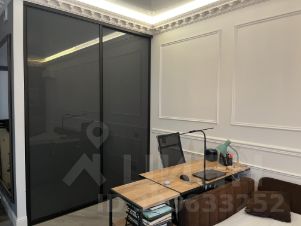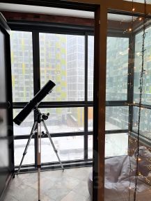 Панорамные окна, вешалка для одежды, большой встроенный шкаф, диван-кровать, кондиционер, два рабочих стола, кухня с индукционной плитой и духовкой-микроволновкой, кухонный стол, холодильник, сетевые розетки. Большой балкон с глубоким шкафом и видами во двор. В ванной: унитаз, стиральная машина, водонагреватель, душевая кабина.