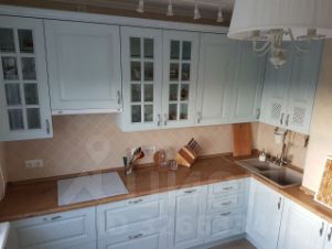 Кухня из массива дерева (итальянские фасады), фурнитура Blum, индукционная варочная панель, посудомоечная машина - Electrolux, духовой шкаф (Bosch). 2 больших встроенных шкафа купе для хранения вещей.