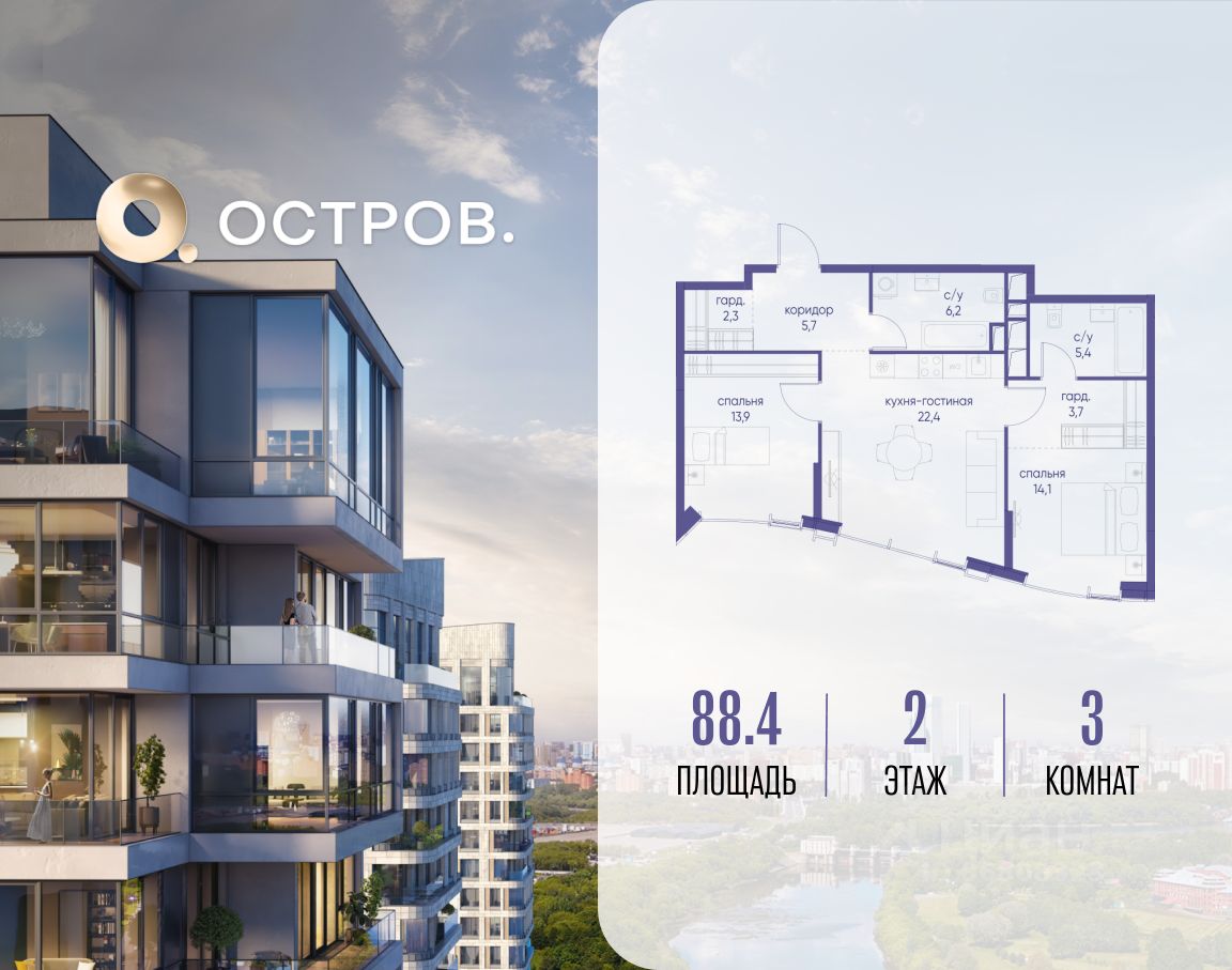 Продаётся 3-комн. квартира от застройщика: общая площадь 88.40 м², жилая м², кухня м², 2-й этаж, жилой квартал "Остров 14", корпус 4 (секция 1). Срок сдачи: 2 квартал 2029 года.